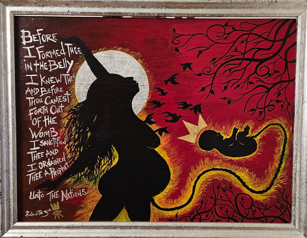 This work serves as a spiritual mandate to the observer, particularly to the male gaze. It demands a stripping away of the "weathered work-boots" of human experience—the personal grievances, the bitterness of failed covenants, and the weight of judgment. By rendering the mother in a silhouette crowned with silver and gold, the artist forces a perspective shift, inviting the viewer to see women—mothers, aunts, grandmothers, and wives—exactly as God intends them to be seen. In this space, the negativity of the past is silenced by the majesty of the "Sacred Seat," and the child is revealed as the "Sacred Seed," a prophet known and ordained before the world was formed.