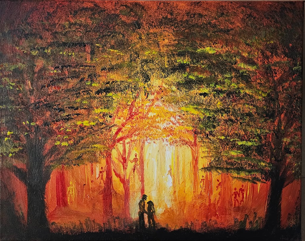 The stagnant air of the "Hollow" is finally displaced by a purifying heat. In this Emberlight, the forest—once a place of dark romanticism and ominous shadows—is surrendered to the flames. This is not a scene of destruction, but of illumination. The fire does not consume the couple; it reveals the spiritual reality of their environment.