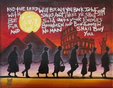 Into Egypt Again With Ships, is a visual meditation on the sobering conclusion of the Mosaic covenant found in Deuteronomy 28:68. The painting captures the moment where divine warning becomes historical reality: "And the Lord shall bring thee into Egypt again with ships... and there ye shall be sold unto your enemies for bondmen and bondwomen." It captures the precise moment where divine warning meets human tragedy, marking the transition of a people from sovereignty into the "ships" of a new, enduring exile.