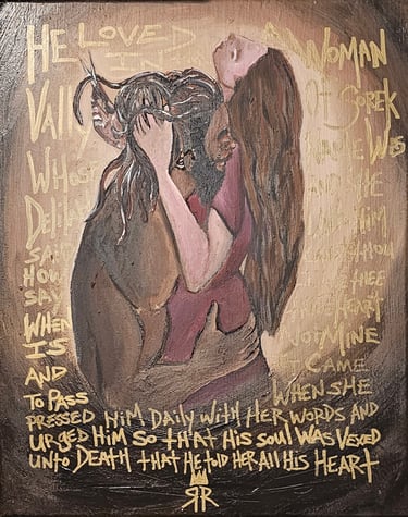 In the painting Samson's Fall, the narrative of Samson is stripped of its historical distance and presented as a raw, visceral study of the cost of spiritual compromise. The composition centers on a profound sensory disconnect; Samson is physically and emotionally enthralled by the moment, his eyes fixated and his spirit intoxicated by a false sanctuary. He is so consumed by his appetite that he is blind to the "art of distraction" being played out behind him. He cannot see the hand poised with the scissors, nor can he feel the "cold steel" of the blade against his hair, symbolizing a state of spiritual anesthesia where one loses their divine covering long before the physical destruction is realized. This internal erosion is framed by the striking placement of gold scripture that anchors the composition. The words "HE LOVED" and "HIS SOUL WAS VEXED UNTO DEATH" highlight the emotional turmoil that precedes the physical fall, with the luminous lettering representing the grace of "High Heaven" being slowly obscured by the encroaching shadows of the "Hollow."