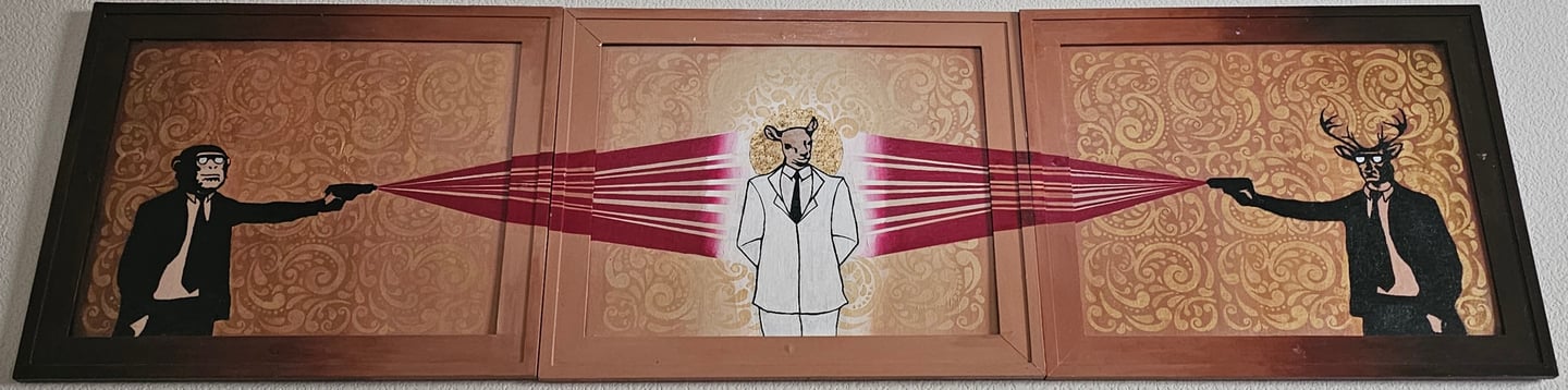 At the heart of the crossfire sits the Lamb, clad in a stark white suit. While the Monkey and the Stag weaponize their intellect and status against one another, the Lamb remains the unfazed center. The stylized red rays emanating from the weapons do not pierce him; instead, he absorbs and reflects the shots, physically preventing the two sides from harming one another. He is the personification of Christ, standing in the gap of human division.