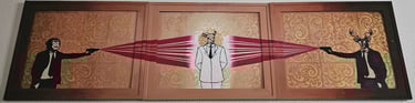 In Standing in the Gap the artist explores the modern "standoff"—the perpetual friction created by labels such as politics, economics, and the battle of the sexes. By personifying these opposing forces as animals in the "civilized" attire of black suits, the painting strips away the veneer of human sophistication to reveal a core that remains dangerously animalistic.