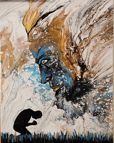 In Submission, the artist captures a profound moment of divine confrontation and human humility, born from an organic "pour paint" experiment that seemed to take on a life of its own. The fluid, chaotic energy of the acrylics coalesces into the towering profile of the Creator, a celestial face emerging from the swirling gold, blue, and white textures of the cosmos. This accidental formation serves as a visual metaphor for the sovereignty of God—reminding the viewer that even in what appears to be a mess or a random "pour," a divine image is being fashioned. The silhouette of the man below, bowed in a posture of complete surrender, provides a sharp, dark contrast to the explosive light of the Father, representing the moment an individual finally stops contending with the Infinite and starts listening.