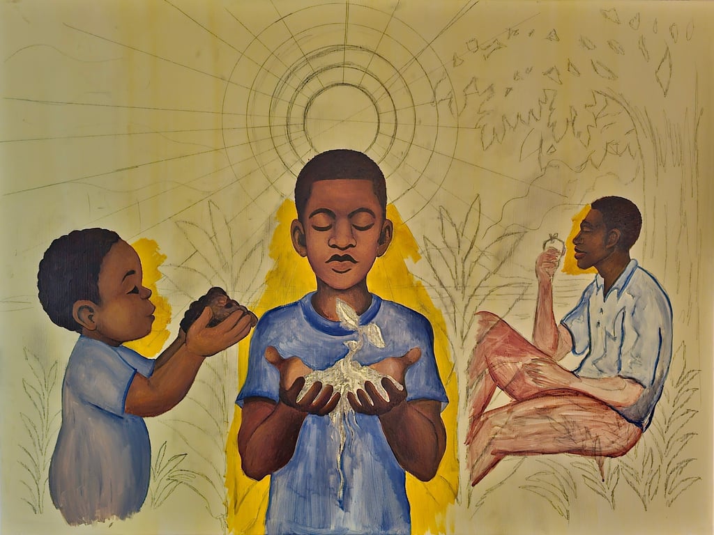 At the center of the composition is "The Boy," representing the stage where the internal lesson begins. In his hands, a vibrant sprout emerges from the darkness, calling to mind the biblical promise that faith as small as a mustard seed holds the power to transform one’s entire reality. The boy is framed by a geometric, concentric halo—the "Overseer" and Father—who provides the divine light and nourishment necessary for this growth. With eyes closed in quiet reflection, he demonstrates a faith that is being strengthened from within, proving that even a tiny sprout, when sustained by the Father’s light, possesses the strength to endure.