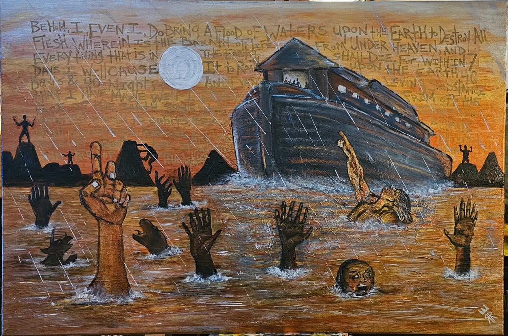The atmosphere is a suffocating, golden expanse where the very air has been weaponized by the Word of God; the scripture from Genesis is woven directly into the clouds and rain, suggesting that the inhabitants are not merely drowning in water, but in the literal fulfillment of a divine decree. This divine fire in the sky contrasts sharply with the thick, opaque slurry of the rising tide, which has swallowed the land and stripped away all human dominion. The jagged peaks still visible are crowded by the last remnants of a distorted civilization, including massive figures whose scale reveals them to be the Nephilim. Standing as large as the mountain summits themselves, these giants—once the dominant force of the "Hollow"—are reduced to frantic, futile climbers, proving that no amount of physical stature or fleshly strength can withstand the supernatural cleansing of the Earth.