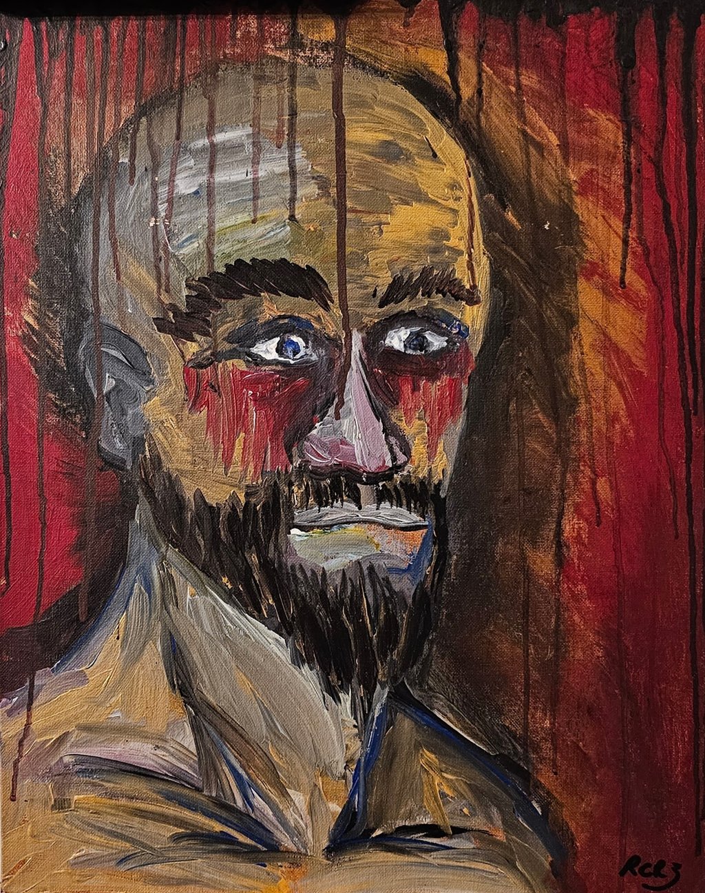 Created nearly a decade before the artist’s own self-portrait, this work represents a time when he could not yet fully see himself. Instead of a direct likeness, he rendered a visible manifestation of his internal feelings—a portrait not of a specific person, but of a blind emotional state. By manifesting these intangible sorrows into a physical being, the artist was able to process his emotions through the face of another before he was ready to confront them in himself. The attributes and techniques captured here—the weight, the bleeding streaks, and the enduring gaze—serve as an artistic precursor, eventually bleeding into his later personal works. This portrait acted as a necessary bridge, allowing the artist to visualize and externalize a spiritual state years before he would ultimately recognize those same attributes within his own reflection.